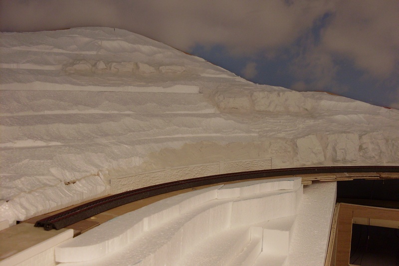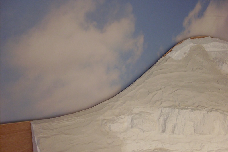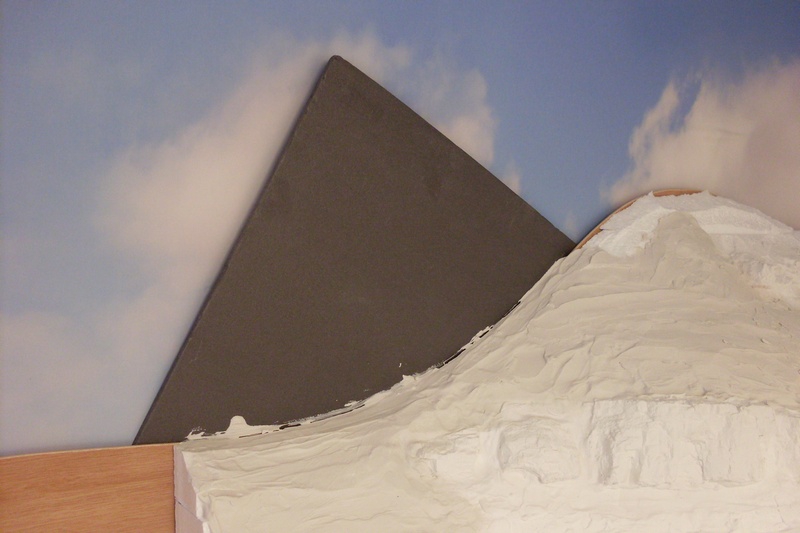 Ik wil jullie nog even het voordeel van een extra achterwand laten zien. Door enkele minimeters tussenruimte te laten tusen de wolkenhemel en de 4mm dikke achterwand, kun je er iets tussen steken om te voorkomen dat de wolkenhemel vervuild. Nu van gips en later door verf, lijm, ed. Hier een foto wat het één en het ander duidelijk maakt: