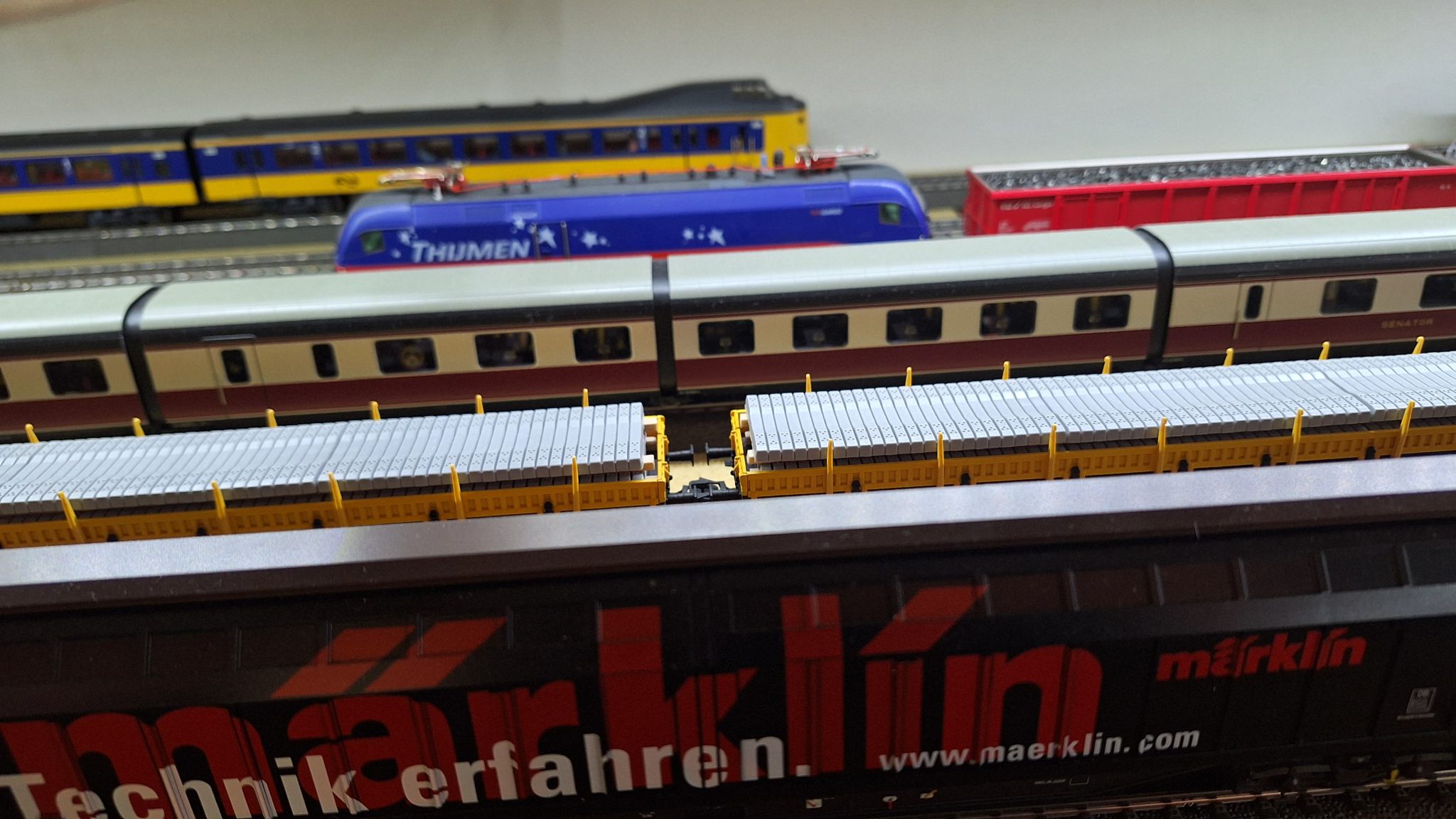 Dankjewel Theo, het is zeker een mooie lading, ik had 5 lagen geprint en hiervan 3 op de wagon geplaatst, de overige twee komen straks wel ergens op de baan te liggen als decoratie.