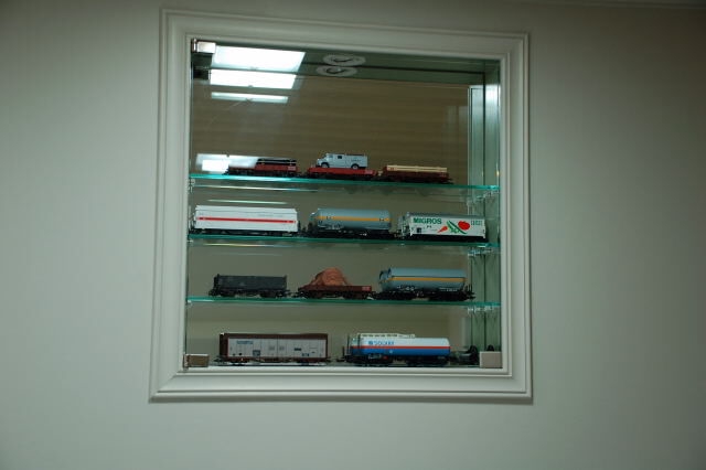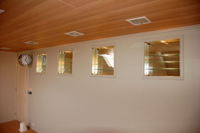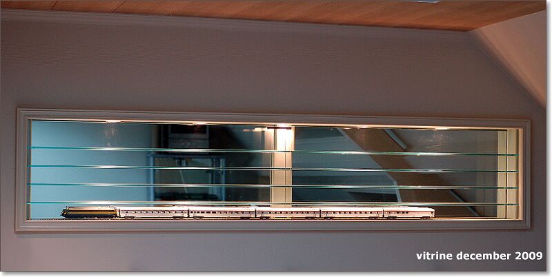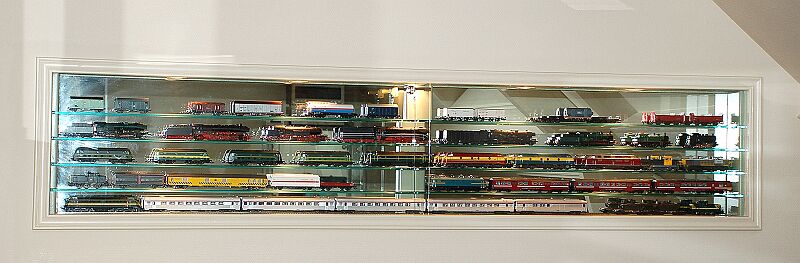 * grote vitrine ingebouwd in de wand, kleine in de valse wand...