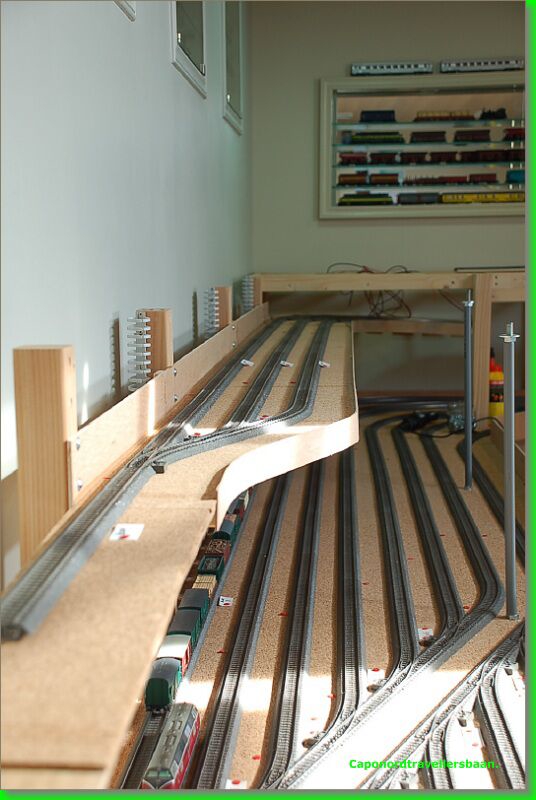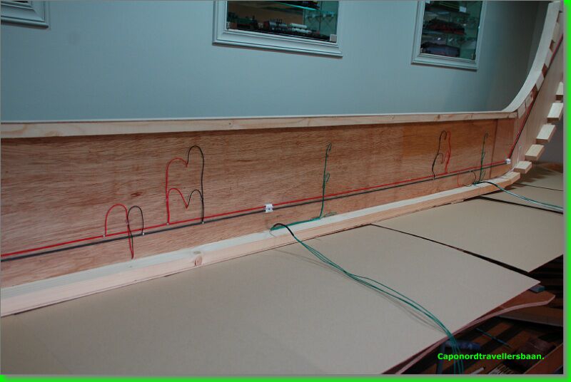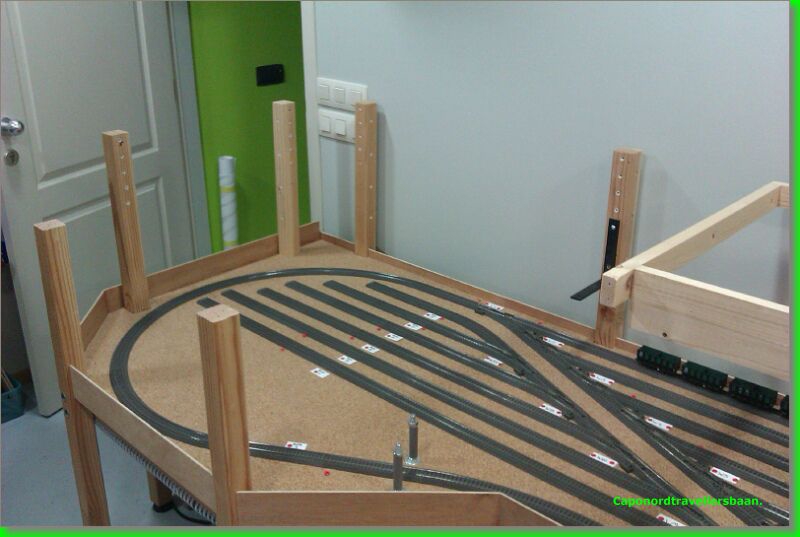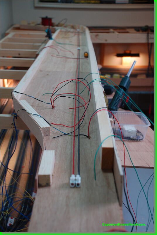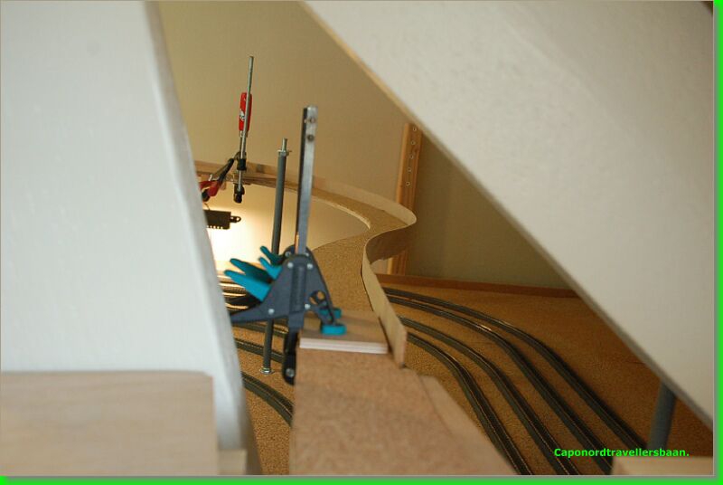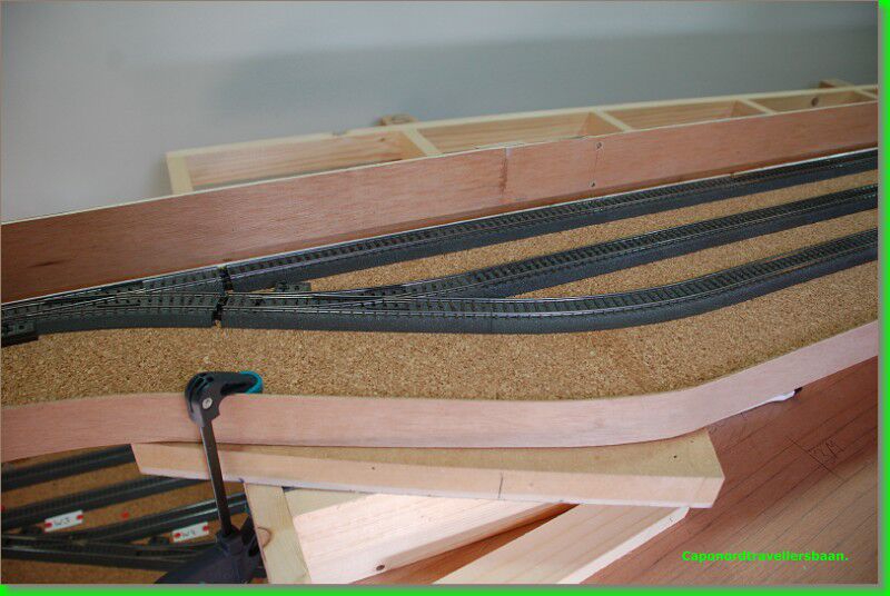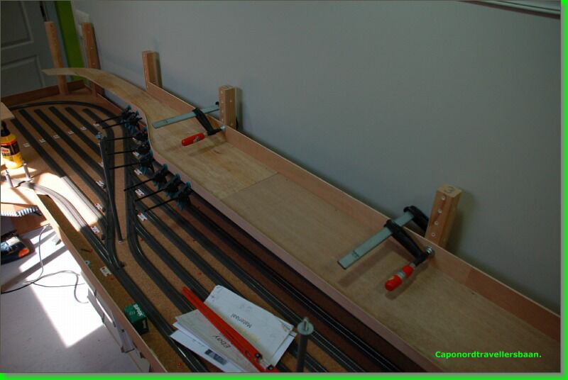 Daarna 4mm kurk erop, vangrails uit multiplex van 3mm er tegen aan en een dagje laten drogen met de spanschroeven erop.