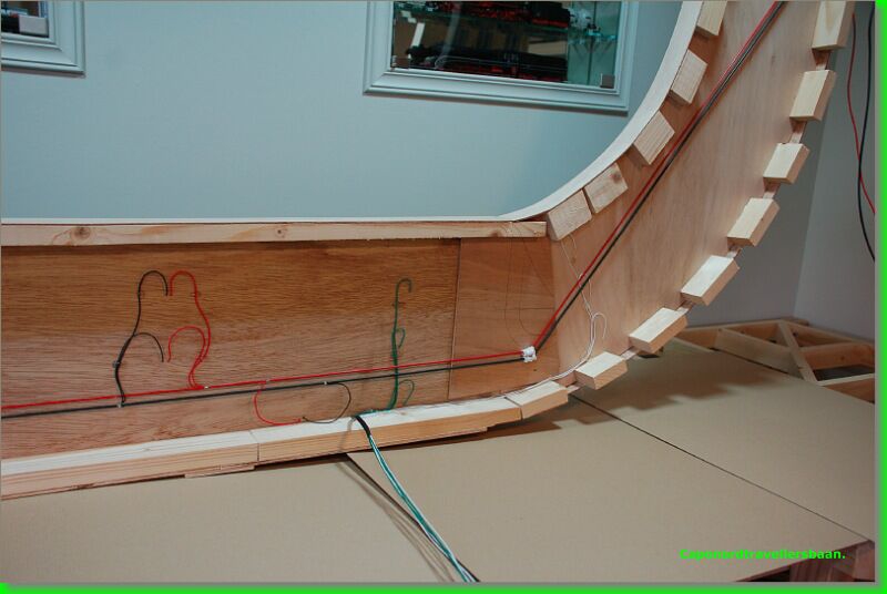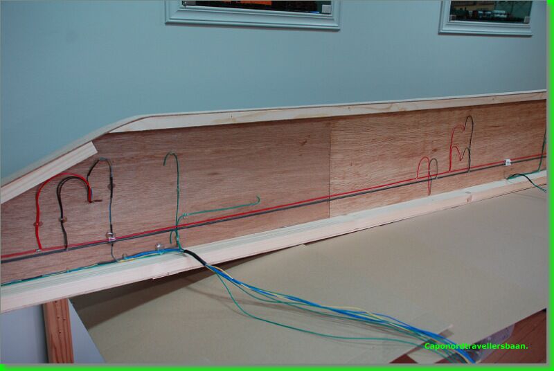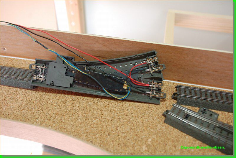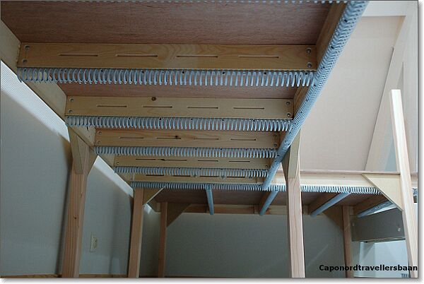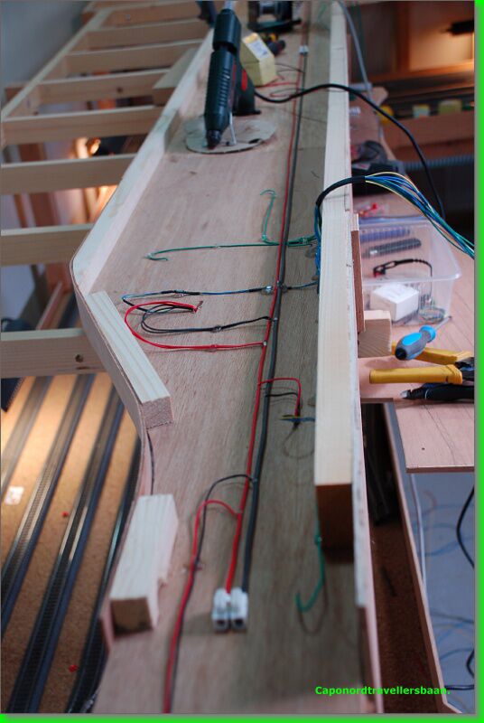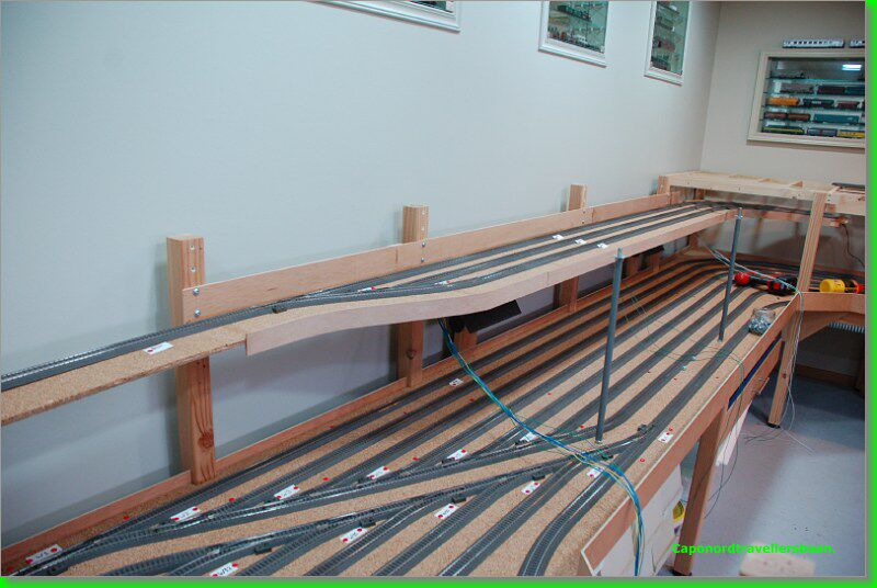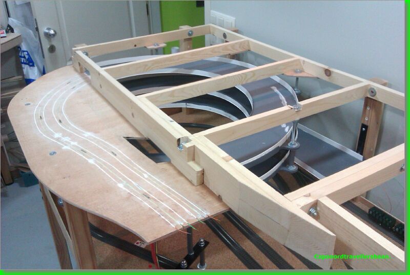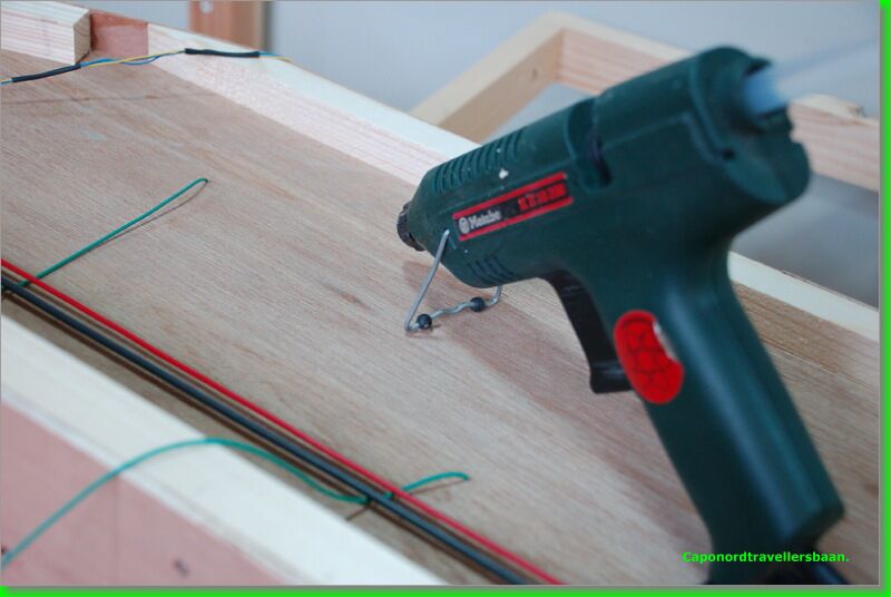 Daarna 4mm kurk erop, vangrails uit multiplex van 3mm er tegen aan en een dagje laten drogen met de spanschroeven erop.