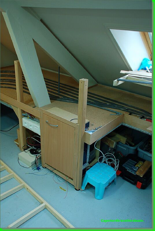 Hoe ? : 2 stukken multiplex van 2m20 aan elkaar verlijmen om een lengte te bekomen van ongeveer 450cm. Decoupeerzaag, schroeven, houtlijm en een portie zin maken het geheel af !
