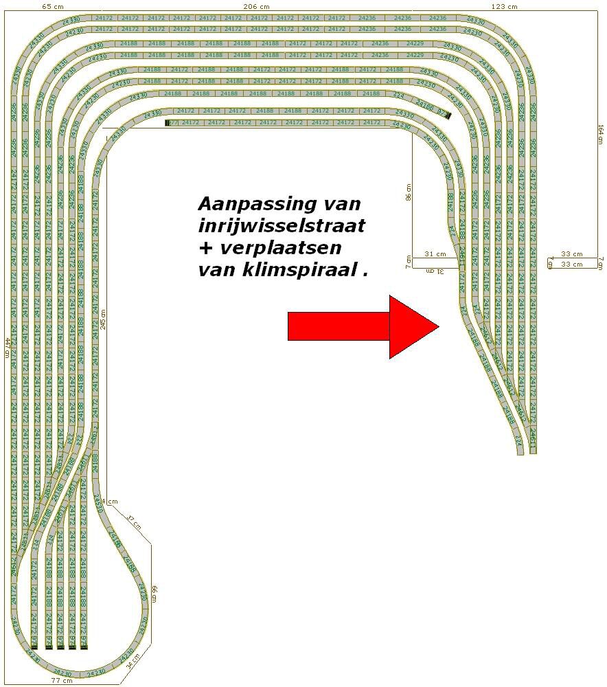 Waarom 1° doordat veel rijtuigen nu op juiste schaal 1/87 gemaakt zijn en niet 1/100, geeft een grotere straal een beter rijgedrag.