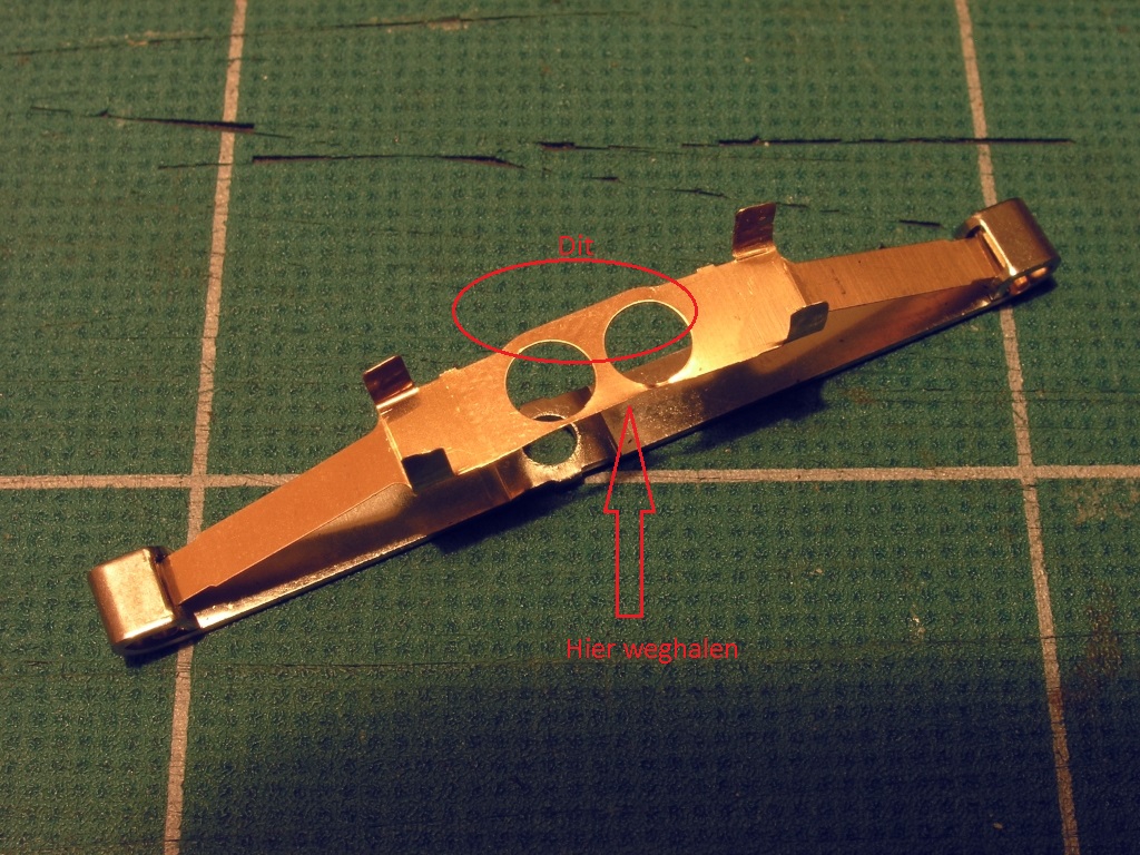 Goed we gaan verder, om de sleper ongeveer in het midden te krijgen, uitgelijnd op de koppelingsgaatjes, er zit namelijk een verdikking op het beschermplaatje.